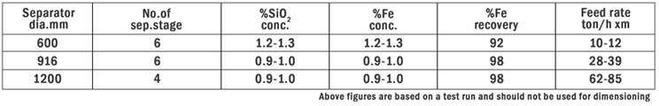 The feed to the separators consisted of partially martitised magnetite ore ground to 75% minus 0.044mm (325 mesh) and the purpose was to produce a concentrate containing less than 1% SiO2.